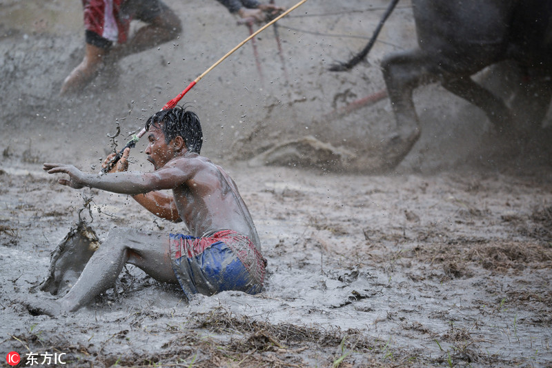 泰国举行年度赛牛节 农民驾牛驰骋泥水飞溅