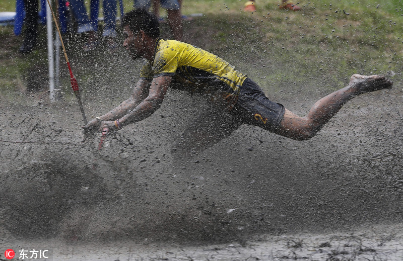 当地时间2018年7月15日,泰国春武里,一年一度的传统赛牛节在水田里精彩举行,参与者驾牛泥地狂奔。
