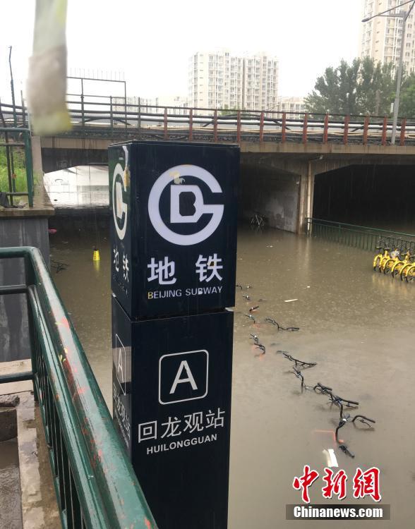 地铁回龙观站周边积水严重,共享单车被淹没。 钟欣 摄
