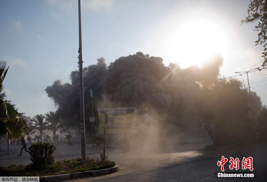 加沙地带卫生部门官员说,加沙城该幢楼房遭以军空袭时,楼内没有人,但身处附近公园的两名十五六岁巴勒斯坦少年丧生,10多名路人受伤。照片显示,那是一幢没有完工的5层楼房。图为被空袭导弹击中的加沙地带的楼房冒出浓烟。