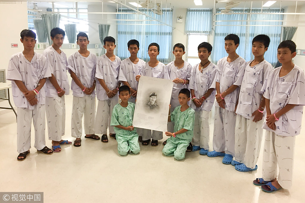 当地时间2018年7月14日,泰国清莱,获救少年足球队成员和教练目前仍在医院接受治疗,他们在为营救他们而牺牲的前泰国海军海豹突击队员的画像上写祝福语并哀悼纪念。当地时间10日晚,在被困溶洞17日后,泰国少年足球队12名成员以及一名教练全部成功获救出洞。这项全球关注的救援行动,动员了超过10国救援人力和上万名军警及志愿者,终于圆满成功。不幸的是,一名前泰国海军潜水员在救援失踪少年足球队员时不幸遇难。
