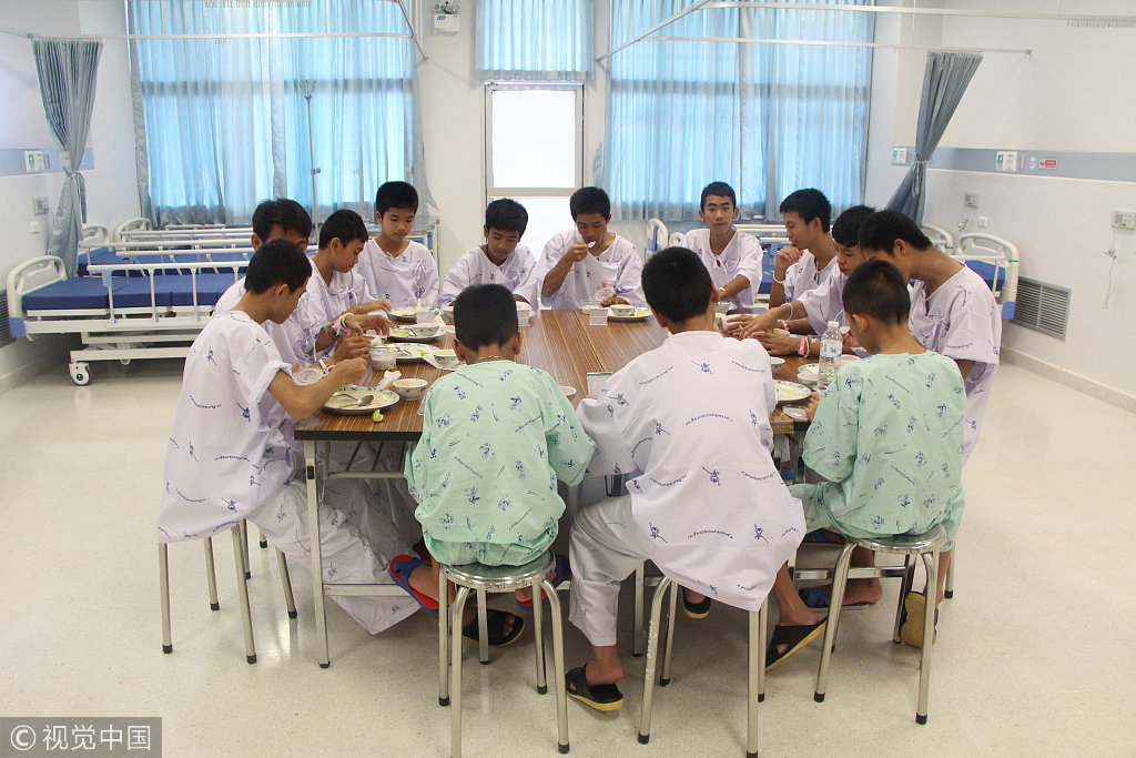 当地时间2018年7月14日,泰国清莱,获救少年足球队成员和教练目前仍在医院接受治疗,他们在为营救他们而牺牲的前泰国海军海豹突击队员的画像上写祝福语并哀悼纪念。当地时间10日晚,在被困溶洞17日后,泰国少年足球队12名成员以及一名教练全部成功获救出洞。这项全球关注的救援行动,动员了超过10国救援人力和上万名军警及志愿者,终于圆满成功。不幸的是,一名前泰国海军潜水员在救援失踪少年足球队员时不幸遇难。