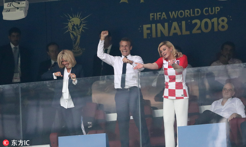 当地时间2018年7月15日,俄罗斯莫斯科,2018年世界杯决赛,法国总统马克龙偕妻子布丽吉特亲自到场观战。
