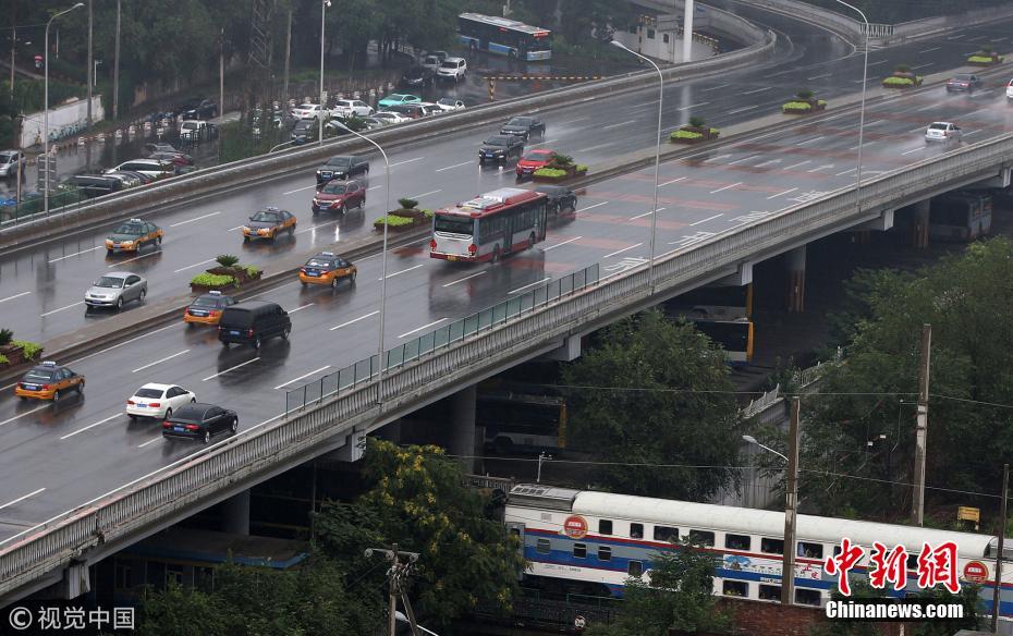 7月16日,北京上空乌云低垂,降雨持续,民众撑伞出行。北京市气象台16日14时40分继续发布暴雨蓝色预警,预计至16日夜间本市大部分地区将有雷阵雨天气,局地短时雨强较大,小时雨强可达30mm以上,山区及浅山区可能出现强降水诱发的中小河流洪水、山洪、地质灾害等次生灾害,低洼地区可能出现积水,请注意防范。图片来源:视觉中国