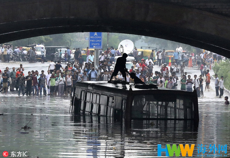 新德里遭暴雨袭击 民众坐公交车顶开启看海模式