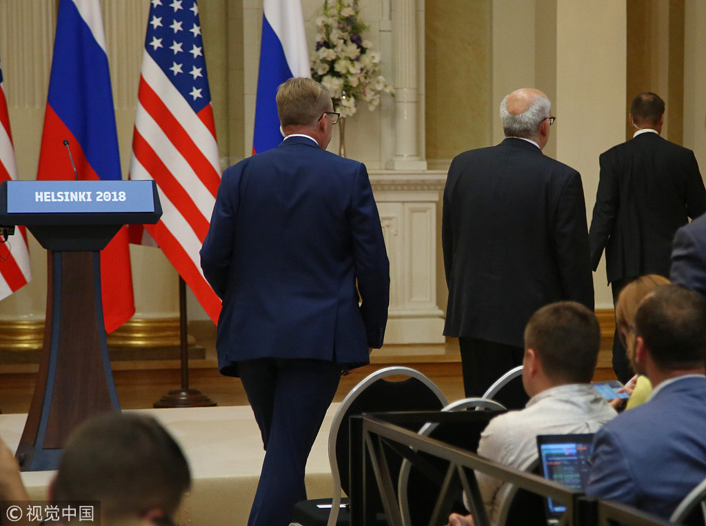当地时间2018年7月16日,芬兰赫尔辛基,一名自称为记者的人手持“禁止核武器试验”出现在美国总统特朗普与俄罗斯总统普京会晤的记者会上,并遭到驱逐。 图片作者:Newscom/视觉中国
