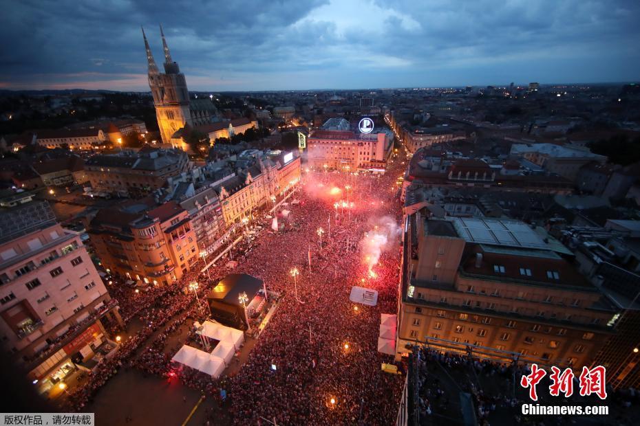 从俄罗斯回国的克罗地亚球员们在萨格勒布举行游行庆典,整个城市陷入狂欢。