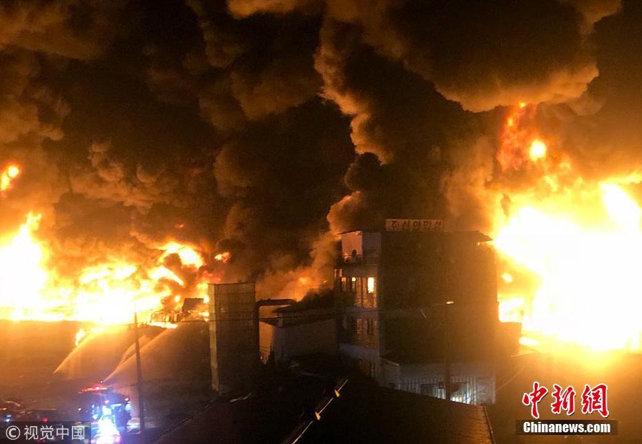 韩国仁川一工厂发生火灾 火柱升腾黑烟滚滚