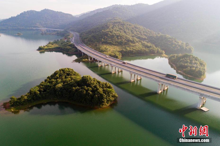 7月17日,航拍江西省最美水上公路——庐山西海水上公路。从江西永修至武宁的永武高速公路横跨在水光山色俱佳的湖面,穿行在千座岛屿之间,如长龙卧波,颜值爆表,美丽无比。行驶其间,犹如身处人间仙境。庐山西海位于江西九江修河中段、庐山西麓,水域面积308平方公里,湖光浩淼、碧波万顷,有3亩以上岛屿1667个,大气中负氧离子含量每立方厘米15万个,是天然氧吧、国家4A级旅游景区。傅建斌 摄