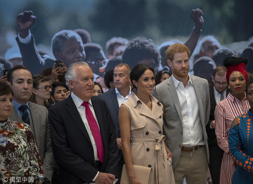 当地时间2018年7月17日,英国伦敦,哈里王子偕王妃梅根出席一场曼德拉诞辰百年纪念展活动。7月18日是已故南非前总统曼德拉诞辰100周年的日子。