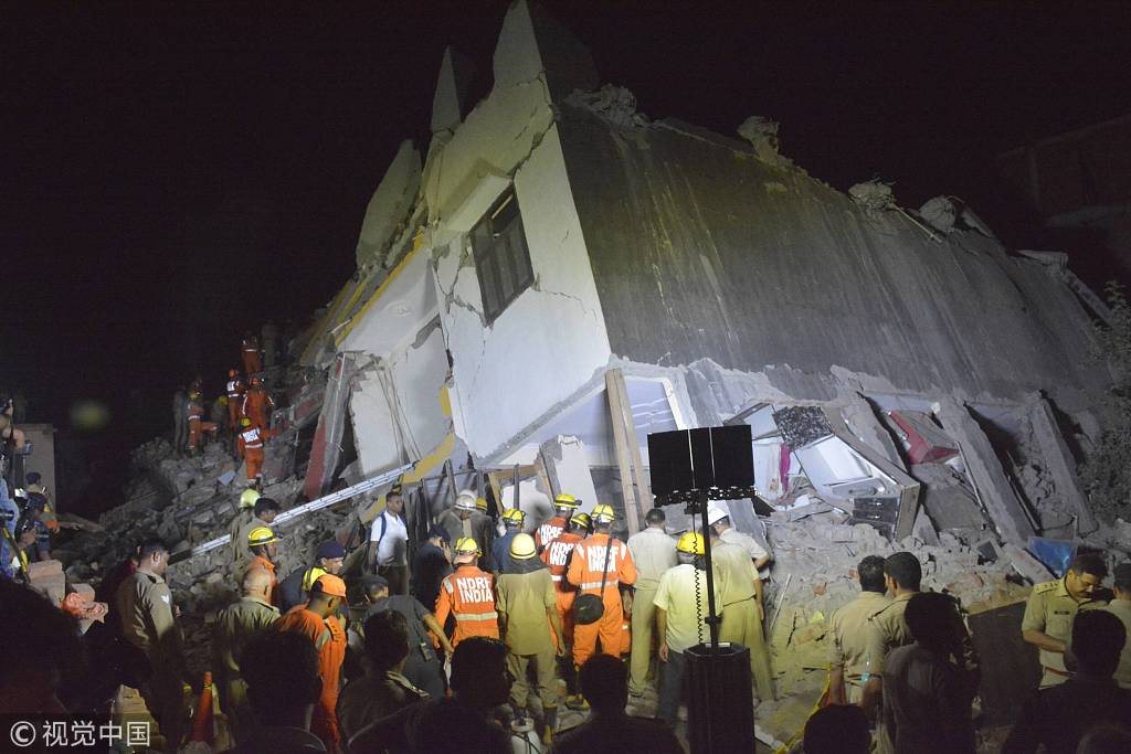 当地时间2018年7月18日,印度北方邦沙阿贝里村17日晚发生一起两栋楼房倒塌事故,造成至少5人死亡,当地警方估计仍有50多人被埋。当地官员说,事故发生在当晚10时左右。一栋6层在建楼房倒塌,撞向毗邻的另一栋4层楼房,两栋建筑沦为废墟。Hindustan Times/视觉中国