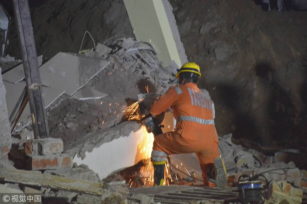 当地时间2018年7月18日,印度北方邦沙阿贝里村17日晚发生一起两栋楼房倒塌事故,造成至少5人死亡,当地警方估计仍有50多人被埋。当地官员说,事故发生在当晚10时左右。一栋6层在建楼房倒塌,撞向毗邻的另一栋4层楼房,两栋建筑沦为废墟。Hindustan Times/视觉中国