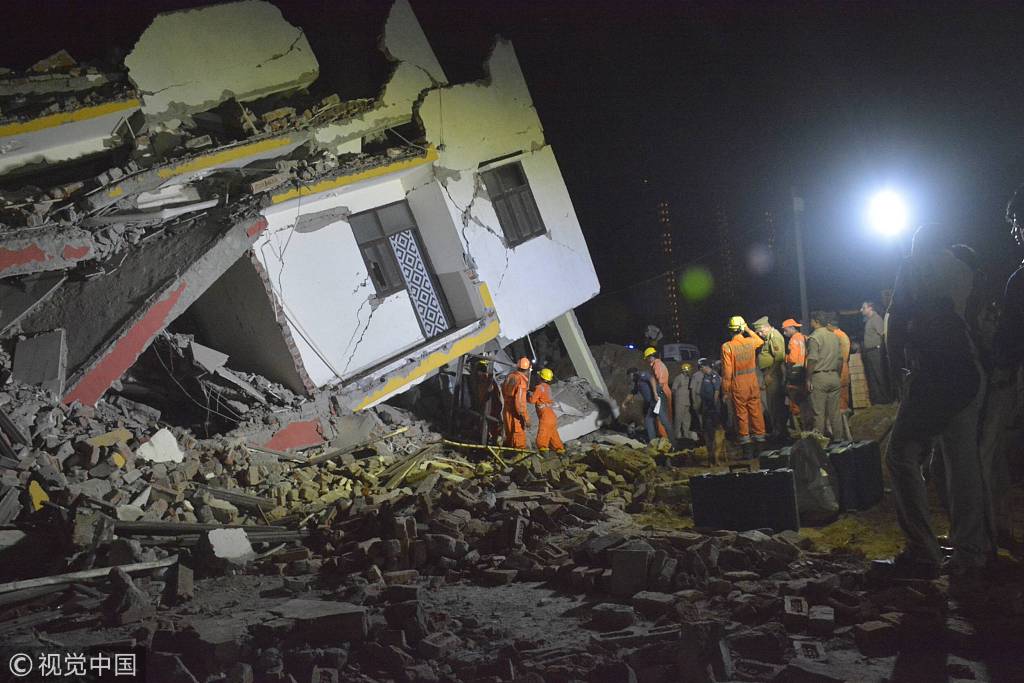当地时间2018年7月18日,印度北方邦沙阿贝里村17日晚发生一起两栋楼房倒塌事故,造成至少5人死亡,当地警方估计仍有50多人被埋。当地官员说,事故发生在当晚10时左右。一栋6层在建楼房倒塌,撞向毗邻的另一栋4层楼房,两栋建筑沦为废墟。Hindustan Times/视觉中国