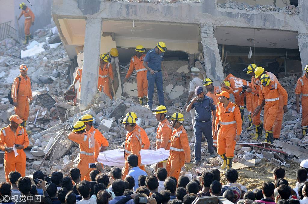 当地时间2018年7月18日,印度北方邦沙阿贝里村17日晚发生一起两栋楼房倒塌事故,造成至少5人死亡,当地警方估计仍有50多人被埋。当地官员说,事故发生在当晚10时左右。一栋6层在建楼房倒塌,撞向毗邻的另一栋4层楼房,两栋建筑沦为废墟。Hindustan Times/视觉中国