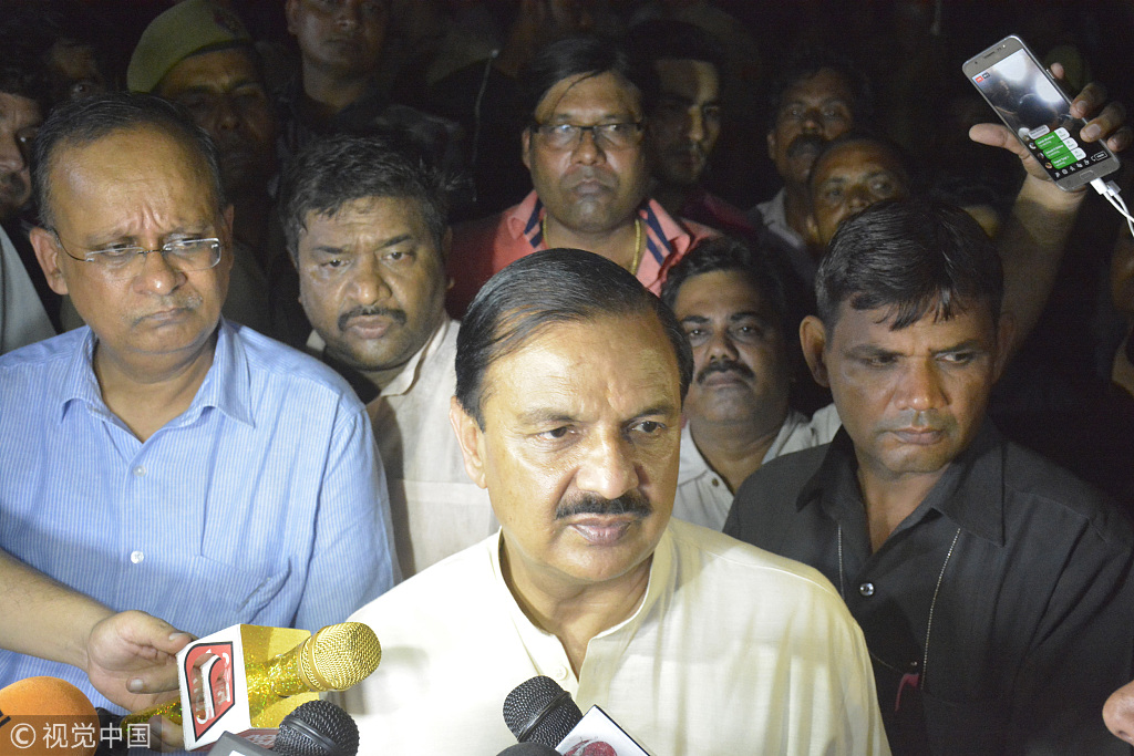 当地时间2018年7月18日,印度北方邦沙阿贝里村17日晚发生一起两栋楼房倒塌事故,造成至少5人死亡,当地警方估计仍有50多人被埋。当地官员说,事故发生在当晚10时左右。一栋6层在建楼房倒塌,撞向毗邻的另一栋4层楼房,两栋建筑沦为废墟。Hindustan Times/视觉中国