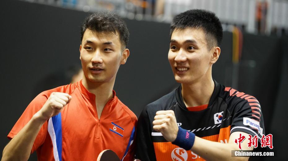 2018年国际乒联世界巡回赛韩国公开赛7月19日开打正赛。韩国选手李尚洙(LEE Sangsu)与朝鲜选手朴信赫(PAK Sin Hyok)组成的韩朝联队男双组合首次亮相,轻松战胜对手顺利晋级。图为二人获胜后。 中新社记者 曾鼐 摄