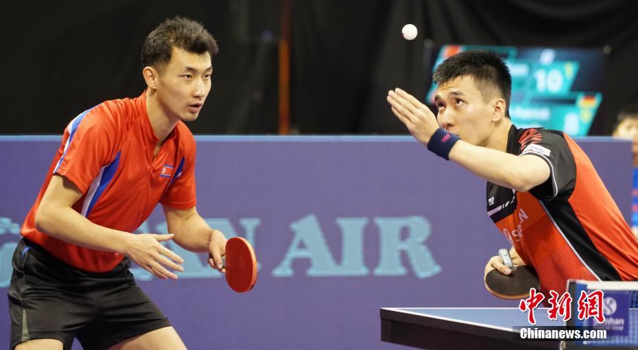 2018年国际乒联世界巡回赛韩国公开赛7月19日开打正赛。韩国选手李尚洙(LEE Sangsu)与朝鲜选手朴信赫(PAK Sin Hyok)组成的韩朝联队男双组合首次亮相,轻松战胜对手顺利晋级。图为二人在比赛中。 中新社记者 曾鼐 摄