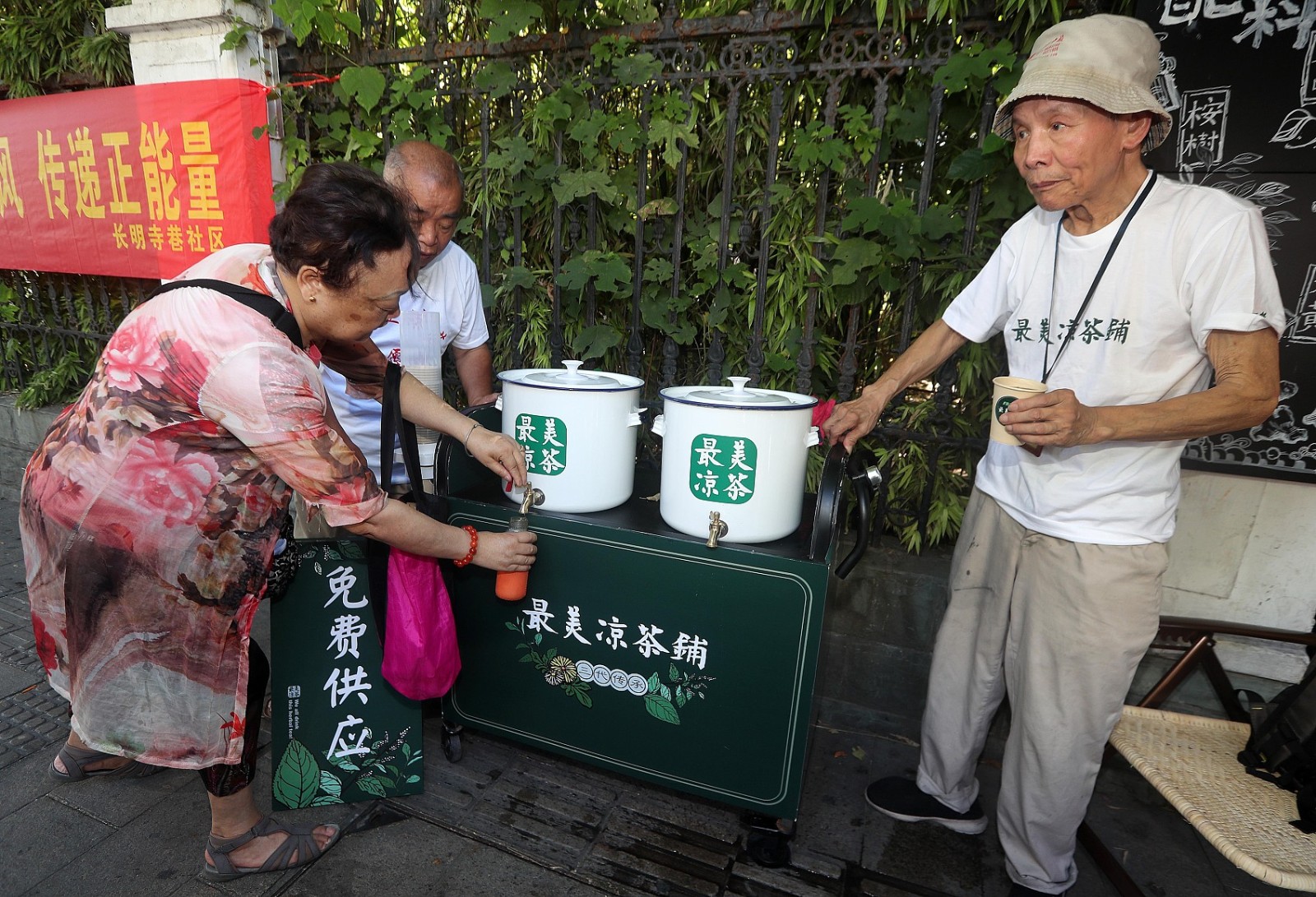 凉茶摊的主人80岁的顾忠根老伯前一天就把凉茶配料准备好,早上5时他就起来烧开水了。