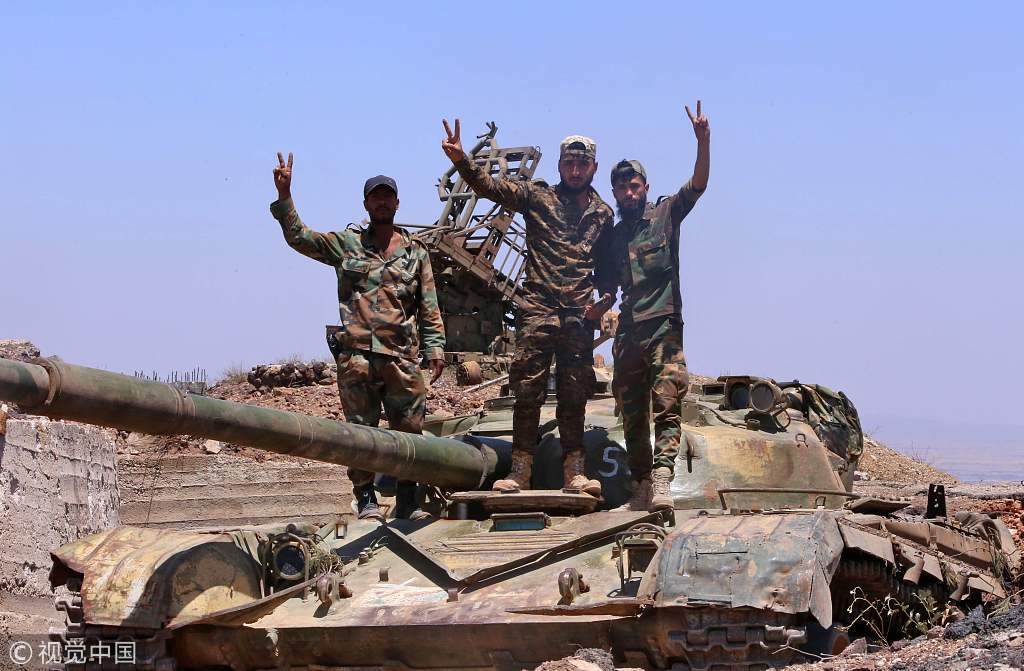 当地时间2018年7月19日,叙利亚政府军士兵从反政府武装手中夺回库奈特拉市。库奈特拉是叙利亚西南部戈兰高地重要城市,库奈特拉省省会。