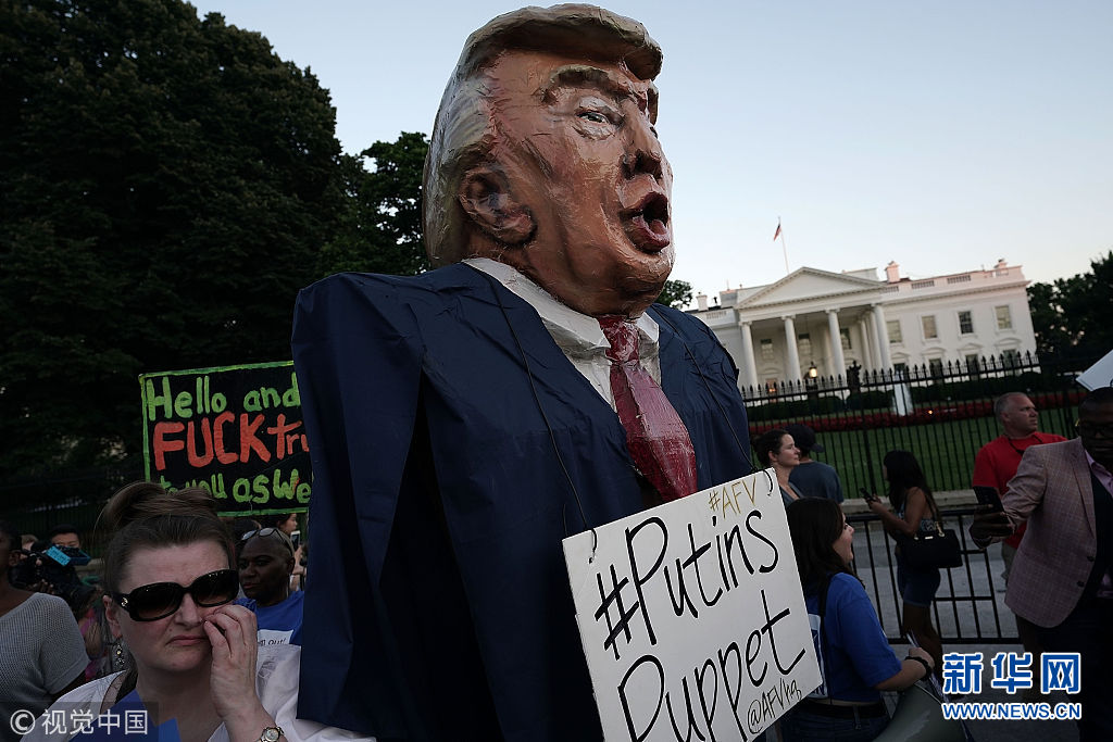 当地时间2018年7月18日,美国华盛顿,数百名美国民众聚集在白宫外参加守夜游行,放置“特朗普”巨型木偶,讽刺其为普京“傀儡”。(图片来源:视觉中国)