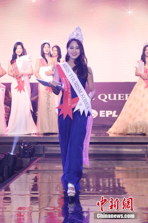 2018世界旅游小姐韩国赛区比赛近日在首尔落幕,朴昭炡摘取桂冠。她将代表韩国参加在中国举办的2018世界旅游小姐全球总决赛。图为朴昭炡接受颁奖。中新社发  钟欣 摄
