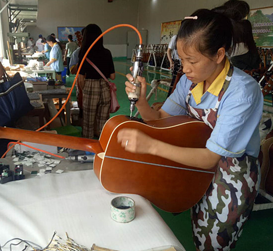 神曲的生产车间里,胡仁群正忙着组装吉他。因为要照顾家里的孩子,她离开在广州打工的鞋厂,回到家乡。目前,神曲公司有650位员工,其中117名贫困户,每月工资3000元左右,让他们有了一份固定的收入。