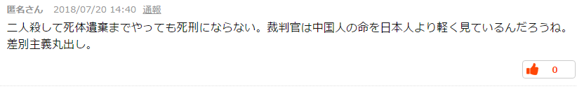 “杀了两个人,甚至还抛尸,这种人必须死刑呀。可能在法官眼里中国人的命没有日本人的值钱吧。赤裸裸的差别主义。”