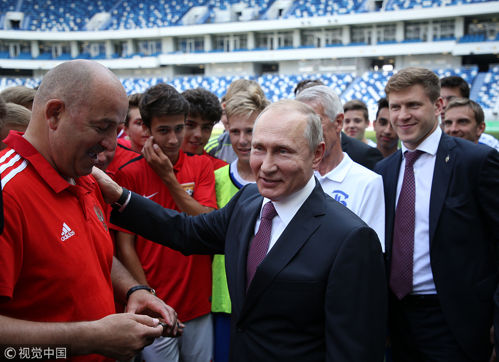 当地时间2018年7月20日,俄罗斯加里宁格勒,俄罗斯总统普京走访加里宁格勒体育场,会见俄罗斯国家队主教练斯塔尼斯拉夫·切尔切索夫,与球员合影。普京周五访问加里宁格勒,召开总统体育委员会会议,讨论刚结束的2018俄罗斯世界杯事宜。图片来源:视觉中国