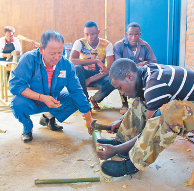 国家林业和草原局竹子研究开发中心援卢旺达竹子项目组专家正在对卢旺达学员进行培训。记者 王云松摄