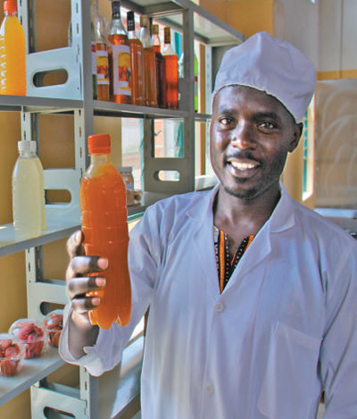 中国援建的穆桑泽职业技术学校里,食品专业学生向记者展示他制作的果酒。记者 王云松摄