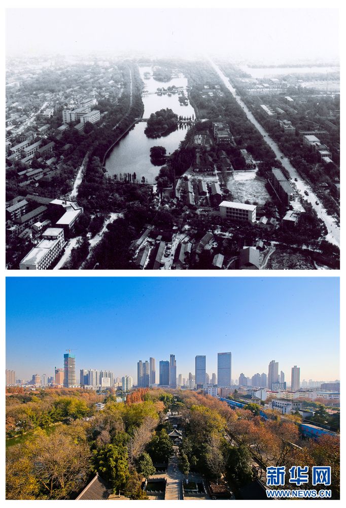 七、包公园之变 上图:1978航拍合肥市芜湖路包河公园 下图:2017年12月18日,合肥包公园,美丽的秋色 作者:黄欣(上)、李福凯(下)