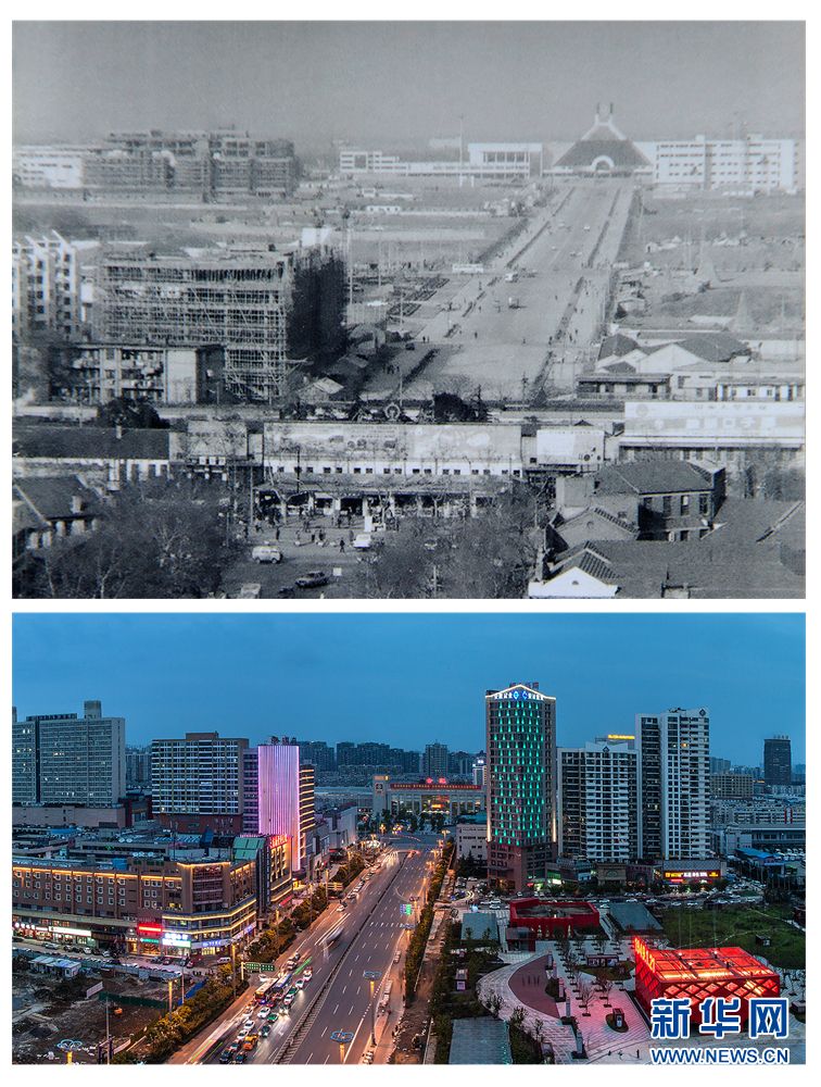 九、胜利路之变 上图:1995年11月拍摄的胜利路北延至老火车站 下图:改造后胜利路华灯初上,北接新合肥火车站 作者:刘长路(上)、童新传(下)