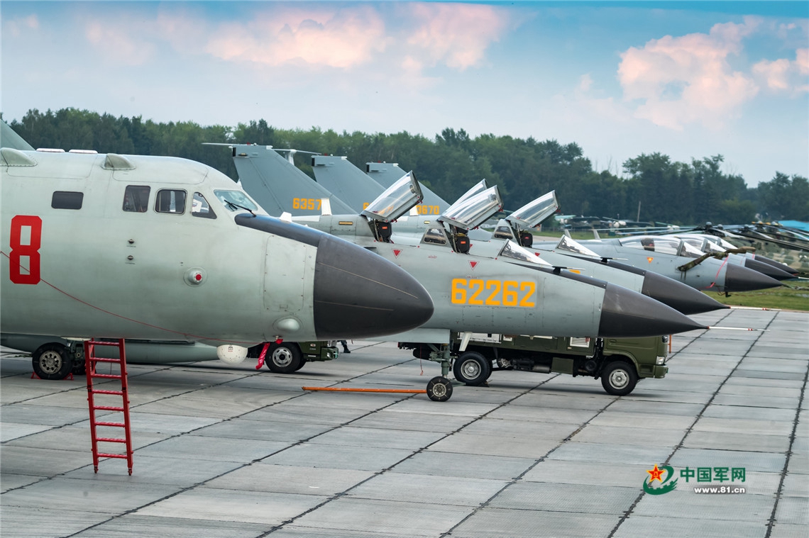 当地时间7月21日,轰-6K、歼轰-7A、歼-10A飞机在停机坪整齐列阵。