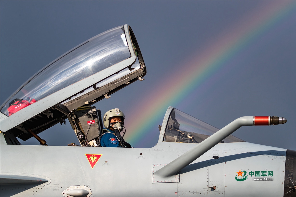 当地时间7月21日,歼-10A飞机飞行员打开舱盖,原本在天空中的彩虹落在了机舱内。