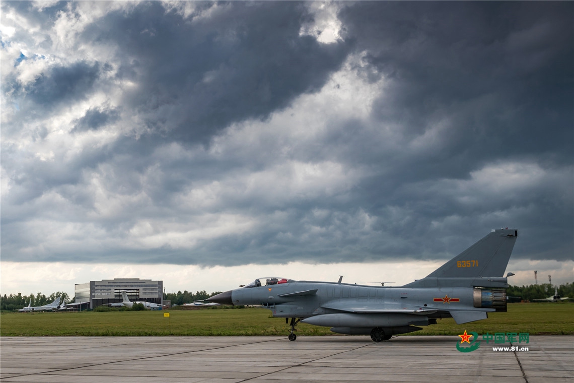 当地时间7月21日,歼-10A飞机在低云降雨条件下,顺利到达比赛机场。