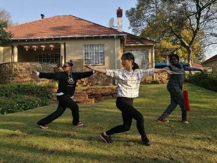 约翰内斯堡大学孔子学院,和煦阳光洒满院落,几名南非学生正在认真练习中国功夫。