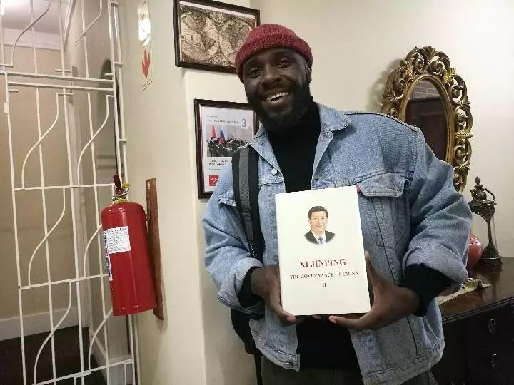 2018年7月20日,南非约翰内斯堡大学孔子学院,学院职员邦加恩向记者展示刚从图书室借到的《习近平谈治国理政》(第二卷)英文版。(新华社记者刘卫兵摄)