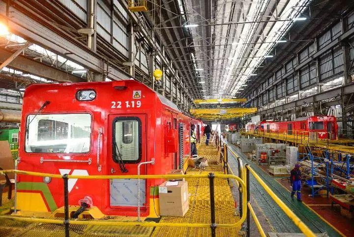 2017年7月27日,南非比勒陀利亚南非运输集团工厂组装车间,两台中国机车等待组装。(新华社记者翟健岚摄)