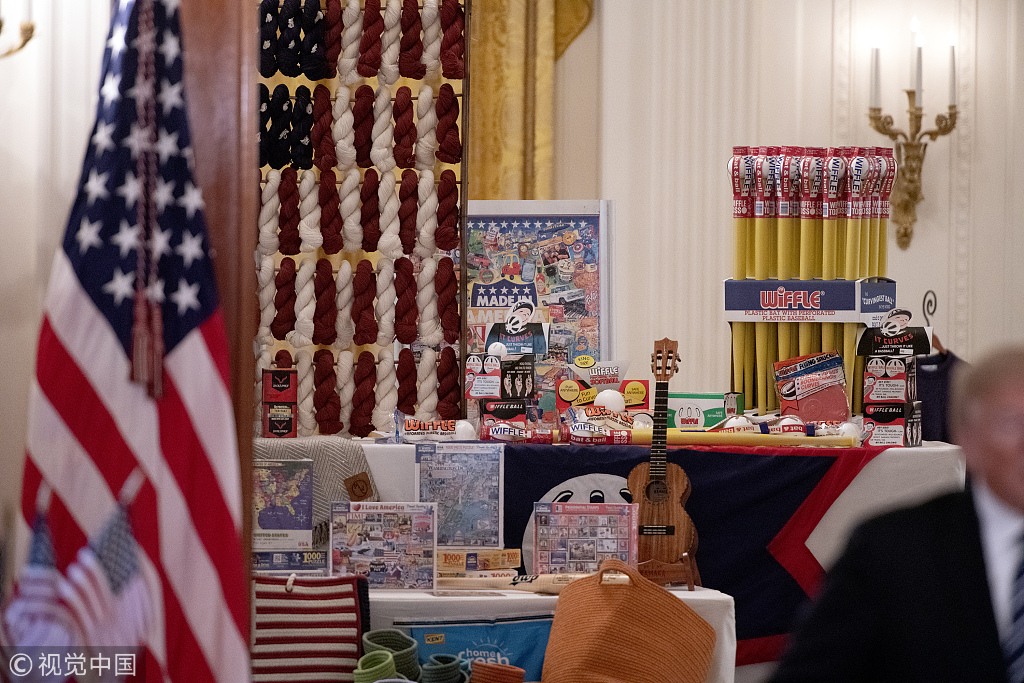 当地时间2018年7月23日,美国华盛顿,美国总统特朗普在白宫举办美国制造产品展览。报道称,展品涵盖从牛肉干牛仔靴等日常消费品到洛克希德马丁公司的F-35战斗机,还包括猎户座宇宙飞船。