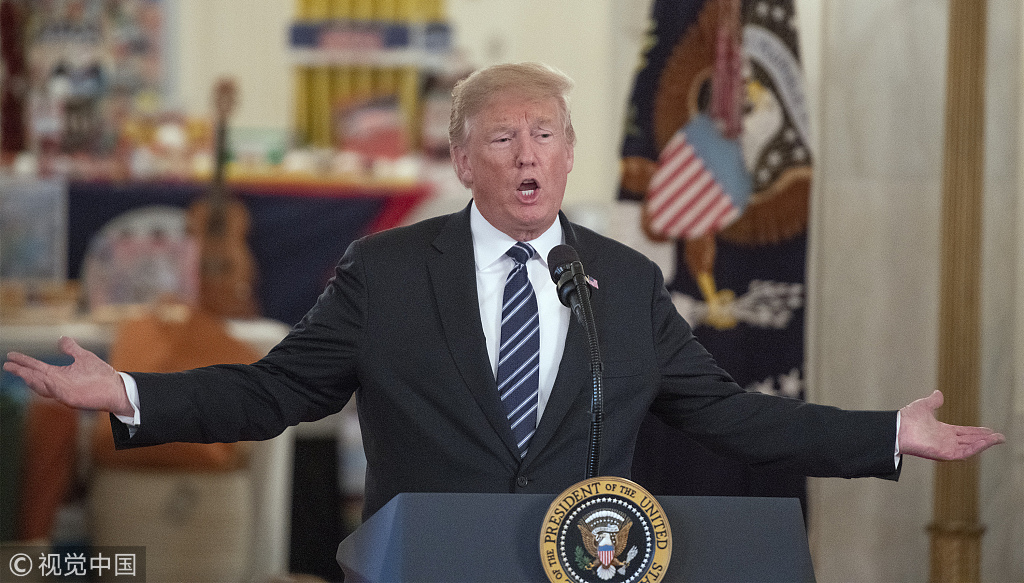 当地时间2018年7月23日,美国华盛顿,美国总统特朗普在白宫举办美国制造产品展览。报道称,展品涵盖从牛肉干牛仔靴等日常消费品到洛克希德马丁公司的F-35战斗机,还包括猎户座宇宙飞船。