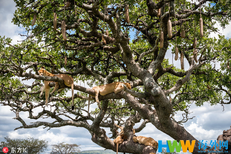 坦桑尼亚狮群枝头午睡 满树挂大喵好不欢快