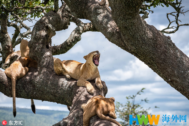 2018年7月24日报道(具体拍摄时间不详),以色列摄影师David Chen在坦桑尼亚塞伦盖蒂平原游玩时邂逅了一个狮子大家庭,它们十分罕见的爬上了一棵大树,齐刷刷挂在枝头午睡小憩。图片中,这群大喵或横趴在枝头,或尾巴和四肢悬空挂在树上,一个个困得七倒八歪画面十分爆笑。在其他的画面中,有一只狮子把脑袋卡在树杈间,睡眼惺忪地望着镜头,困不可支,而还有一个家伙张大嘴巴打哈欠。