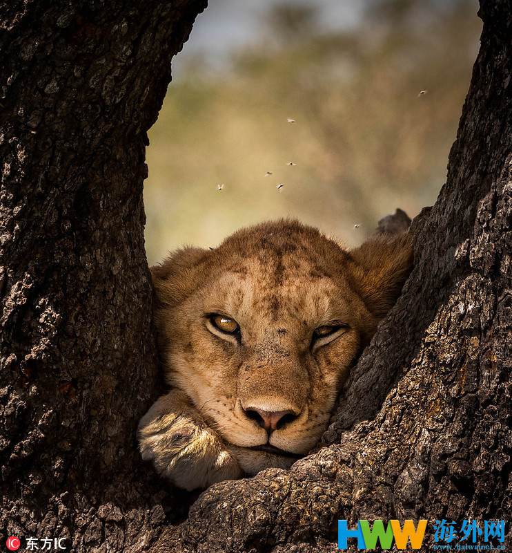 2018年7月24日报道(具体拍摄时间不详),以色列摄影师David Chen在坦桑尼亚塞伦盖蒂平原游玩时邂逅了一个狮子大家庭,它们十分罕见的爬上了一棵大树,齐刷刷挂在枝头午睡小憩。图片中,这群大喵或横趴在枝头,或尾巴和四肢悬空挂在树上,一个个困得七倒八歪画面十分爆笑。在其他的画面中,有一只狮子把脑袋卡在树杈间,睡眼惺忪地望着镜头,困不可支,而还有一个家伙张大嘴巴打哈欠。