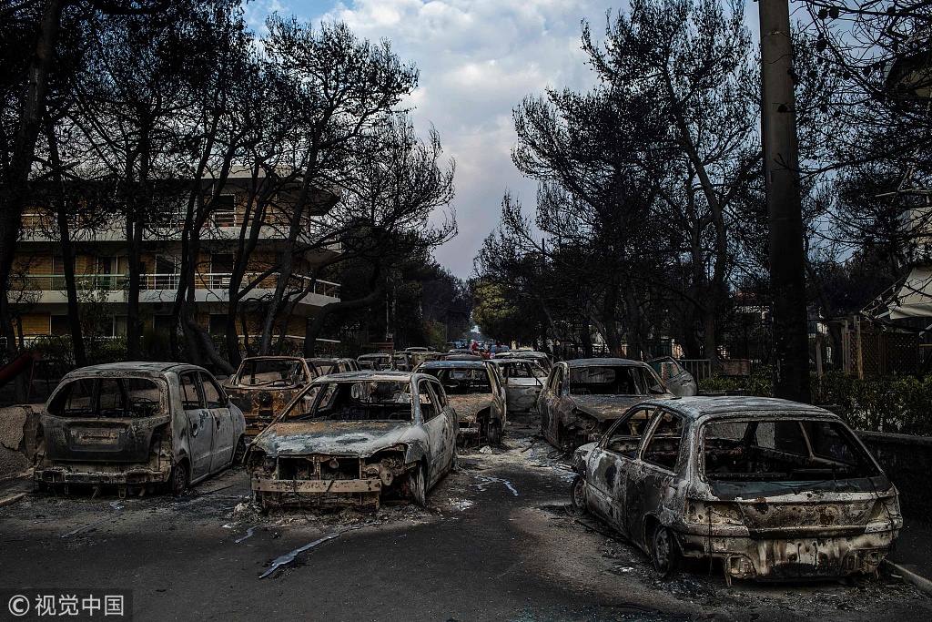 当地时间2018年7月24日,希腊雅典,雅典郊区的Mati村遭遇山火袭击后一片废墟,多人遇难。图片来源:视觉中国