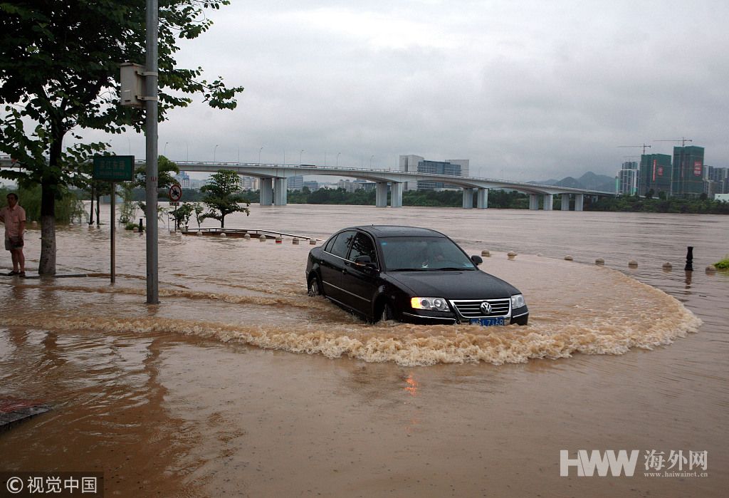 2009年7月3日,广西柳州出现暴雨,柳江水位涨上城区道路。 一辆汽车在水中行走。图片作者:颜篁/视觉中国