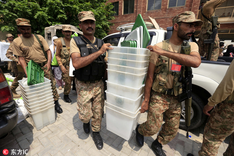 当地时间2018年7月24日,巴基斯坦白沙瓦,巴基斯坦大选前夕,投票箱等选举相关物品在士兵护送下抵达投票站。