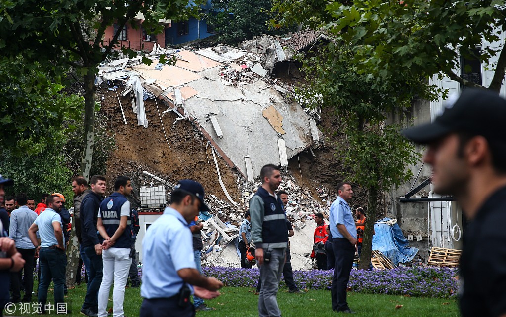 当地时间2018年7月24日,土耳其伊斯坦布尔,施工导致一处公寓所在山坡发生滑坡,公寓楼体部分悬空,随后发生坍塌。