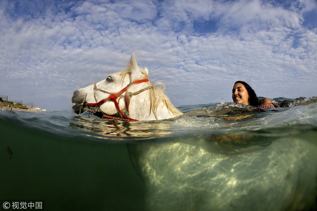 2018年7月24日讯(具体拍摄时间不详),英国康沃尔郡,游客在芒茨海湾体验骑马入海游泳。