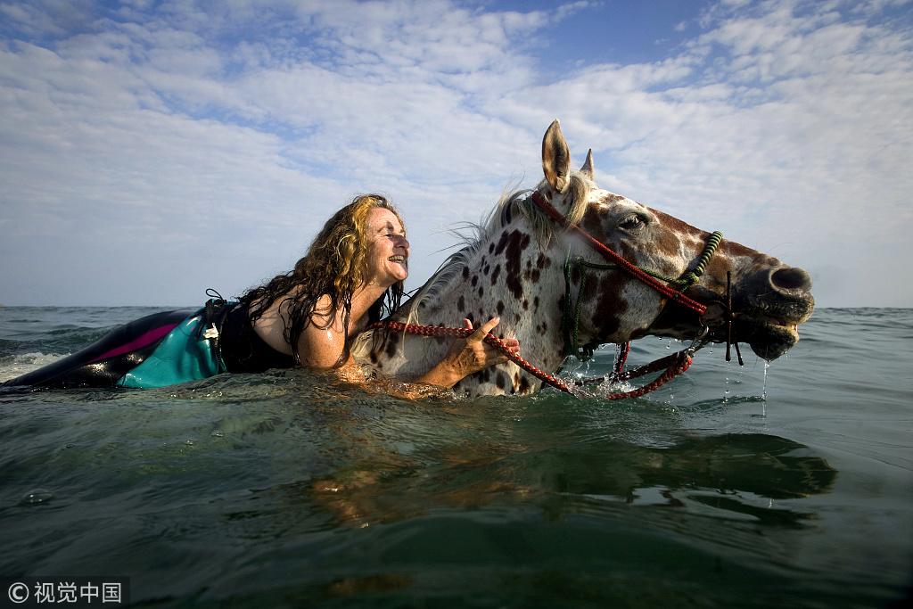 2018年7月24日讯(具体拍摄时间不详),英国康沃尔郡,游客在芒茨海湾体验骑马入海游泳。