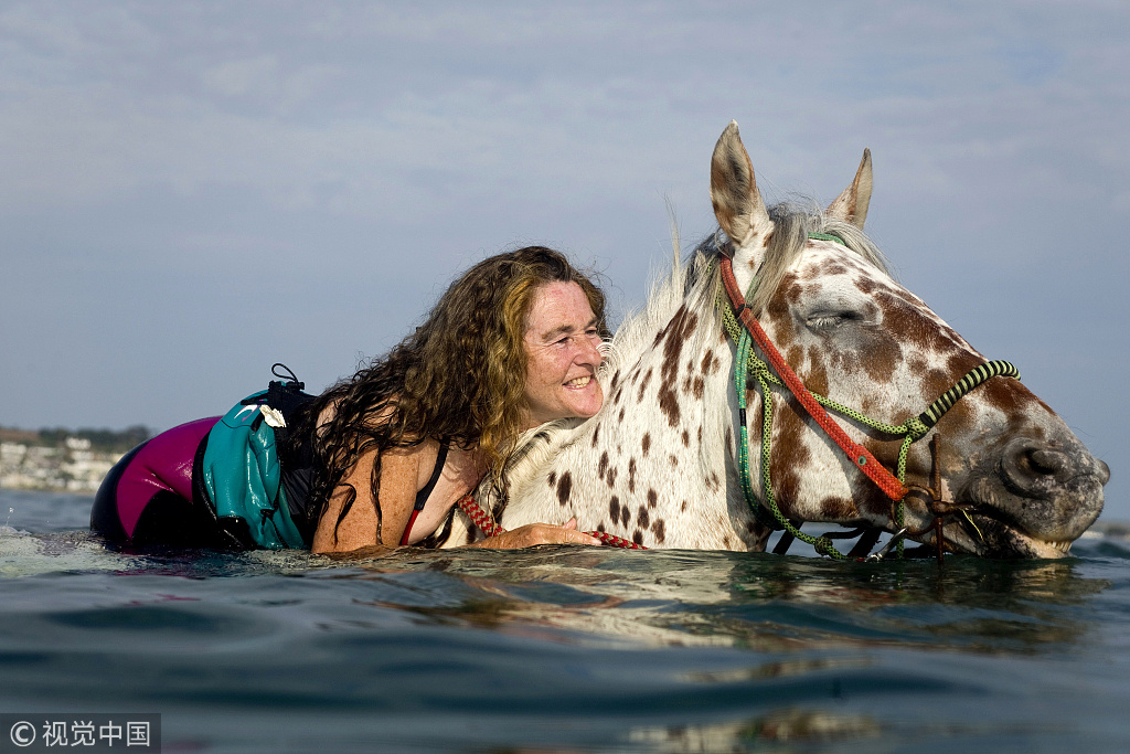 2018年7月24日讯(具体拍摄时间不详),英国康沃尔郡,游客在芒茨海湾体验骑马入海游泳。